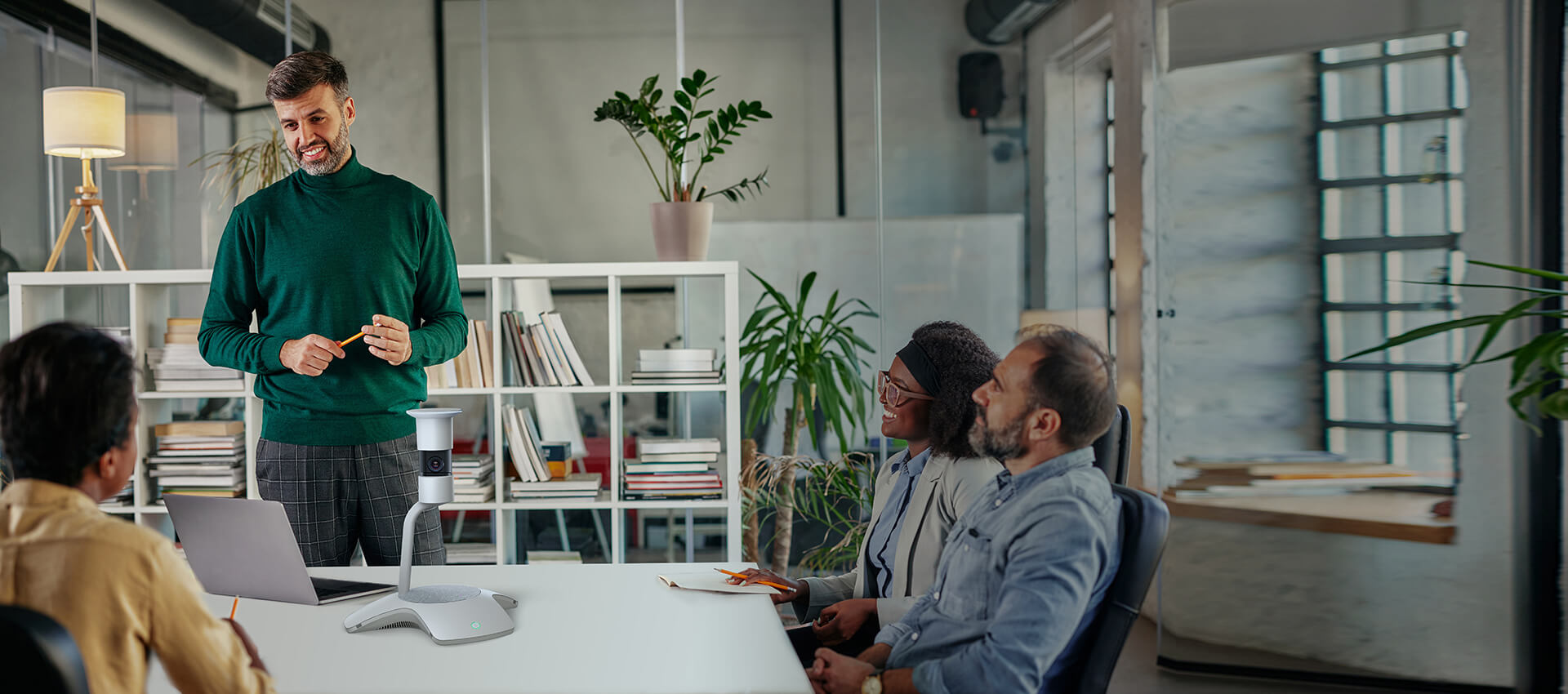 La función Multi-Stream People Feed crea transmisiones de vídeo individuales de cuatro altavoces activos de la sala y las une, mostrando la vista panorámica de la sala al mismo tiempo. Esta función permite que todos los presentes en la mesa de conferencias aparezcan en primer plano en la pantalla con total nitidez. Ninguna expresión facial ni el lenguaje corporal serán ignorados, incluso en una reunión híbrida. Cada conversación es más nítida que nunca.