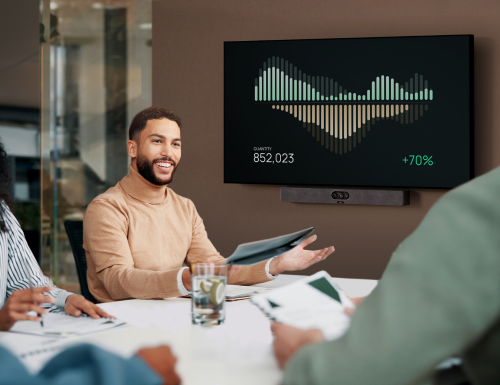 Gracias a la IA integrada con funciones como IntelliFocus, autoencuadre, seguimiento de altavoces, imagen en imagen (PiP) y perímetro de video, el dispositivo optimiza el enfoque y mantiene la atención donde se necesita, brindando equidad visual a todos los asistentes.