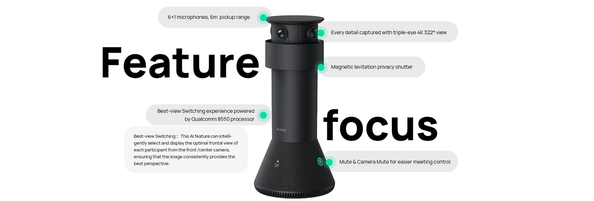 Gracias a su sistema de tres cámaras dispuestas en forma circular, MTower ofrece una visión envolvente y nítida de todos los asistentes, registrando cada gesto y expresión con una claridad impresionante. Incorpora además un conjunto de 6+1 micrófonos en la parte superior, que optimizan la localización precisa del sonido en la sala.