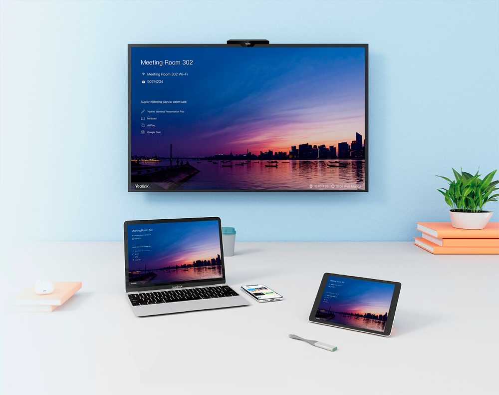 RoomCast permite a los usuarios disfrutar de compartir con un solo toque para una colaboración fácil y productiva con Yealink Wireless Presentation Pod, Miracast, AirPlay y Google Cast.