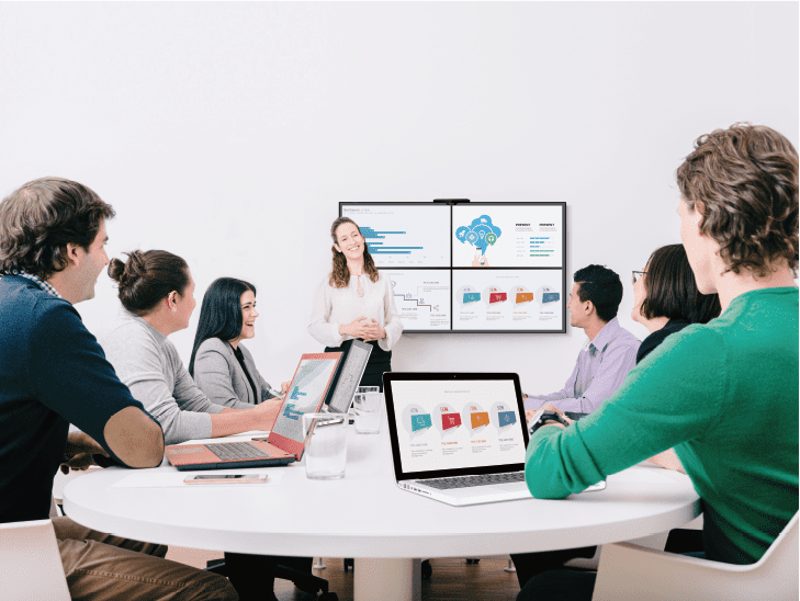 Además, RoomCast es compatible con las funciones de colaboración, como pizarra, anotaciones y control remoto intuitivo, lo que permite generar ideas creativas e interacciones en tiempo real.