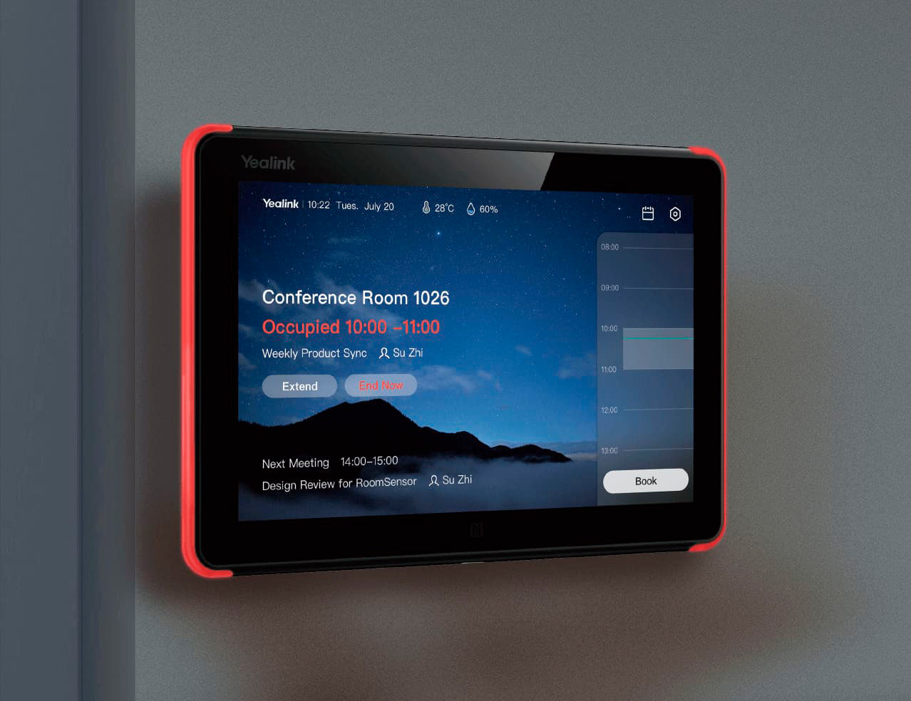 Yealink RoomPanel es un dispositivo profesional de programación de salas multifunción con pantalla táctil de 8 pulgadas, sistema operativo Android 9.0, LED full-RGB, micrófono dual y matriz de altavoces. El panel todo en uno no solo muestra el estado de la sala, sino que también permite reservar todas las salas de reuniones de la organización.
