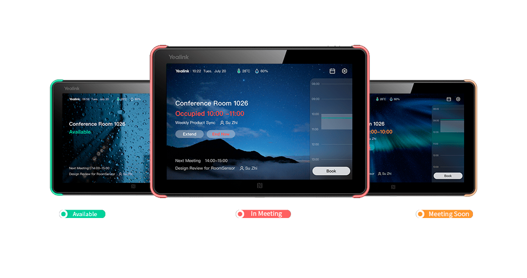 Yealink RoomPanel es un dispositivo profesional de programación de salas multifunción con pantalla táctil de 8 pulgadas, sistema operativo Android 9.0, LED full-RGB, micrófono dual y matriz de altavoces. El panel todo en uno no solo muestra el estado de la sala, sino que también permite reservar todas las salas de reuniones de la organización.