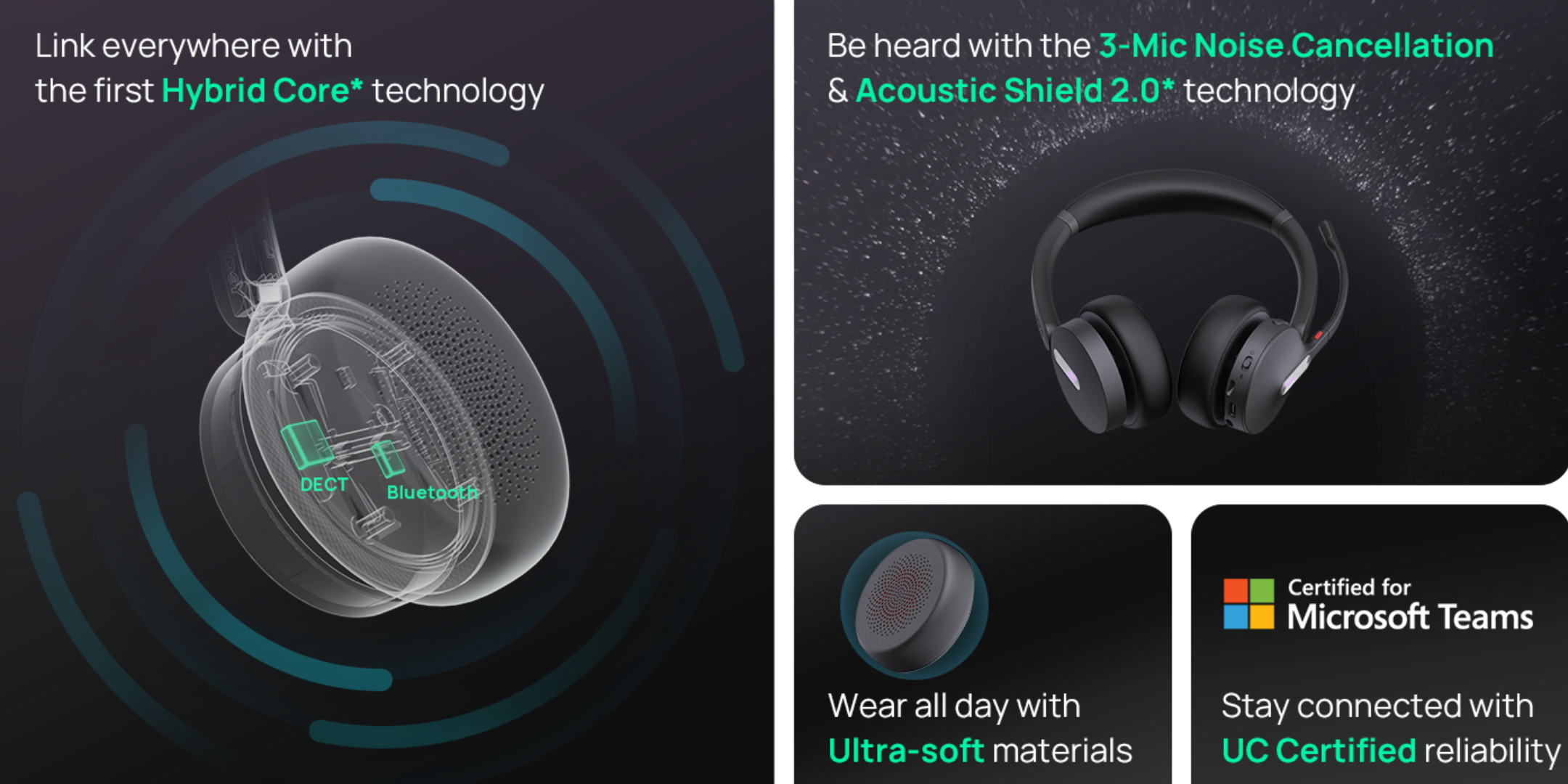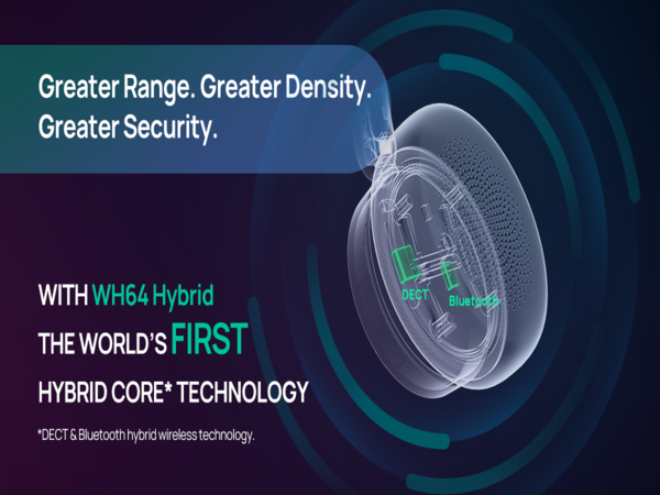 Presentamos el núcleo híbrido* : al integrar dos núcleos, Bluetooth y DECT, en un solo auricular, combinamos la movilidad y la facilidad de uso de Bluetooth con la conectividad robusta y el alcance extendido de DECT , lo que garantiza una experiencia UC excepcional en entornos profesionales .